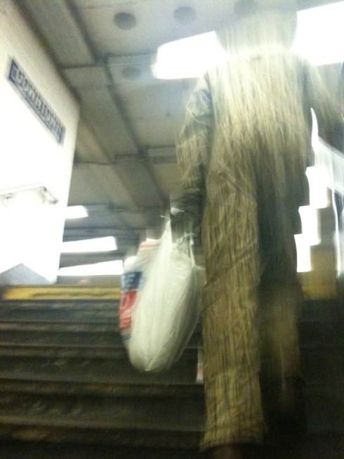 Let’s call him, “Mr. Serial Killer”. A few weeks ago I was taking the C train home after a fun night out on the town and I noticed that sitting directly across from me was this massive heap of a scary dude. His soulless blank expression wasn’t much to work from but his attire spoke volumes. He wore a dirty “hunting in tall grass for deer” hooded jumpsuit and these thick black gloves and some huge ass construction worker boots that I could imagine he had gotten off a victim. It was about 63 degrees outside, so he couldn’t have been cold. The only logical conclusion was that he was returning from a night of vigorous killing. Once the train stopped at my stop I got out and noticed that he also left the train. I proceeded to do the only sensible thing I could think of and that was to follow him and take pictures. I was also trying to not get caught and killed. This was the only shot I got of him. I was nervous and kept screwing up the shot, sue me.