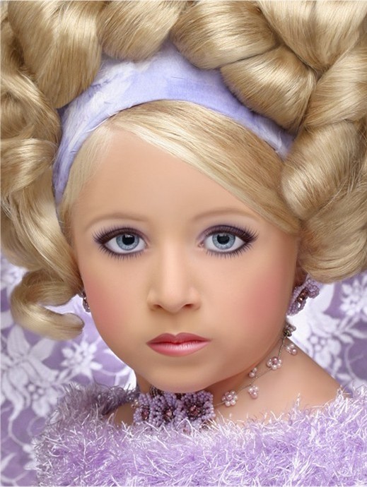 These poor girls get their teeth bleached (or wear false teeth over their own growing in teeth), wear wigs, bleach, highlight, dye and fry their hair, spray tan, pluck/shave/wax their eyebrows, wear false eyelashes, as well a thick ass layer of whore-like makeup (what?), practice their walk and “talent” sometimes 2 hours a day with their obsessive controlling overbearing mothers who force their dreams into their children’s heads, and eventually these girls learn to become unbearable control freak nightmare children who will very very very unlikely reach the goal of being either Ms. America or taking over Angelina Jolie’s spot in Hollywood after the government finds out Angie adopts the kids so she can milk the life force out of them and stay young and beautiful forever.